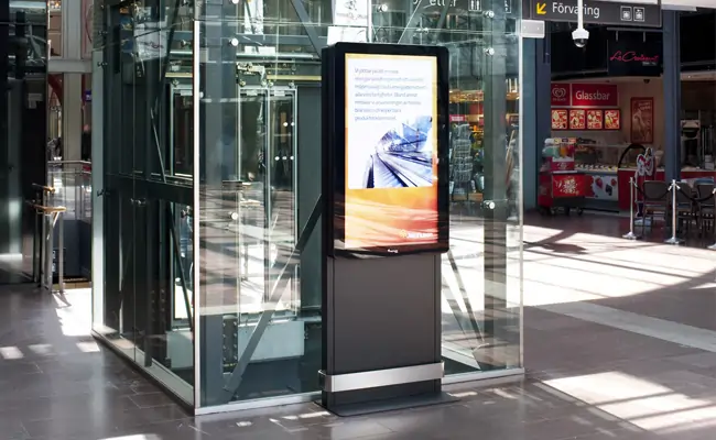 Digital Signage steht für digitale Beschilderung / digitale Anzeigen / digitale Werbung. In Schaufenstern zeigen Public Displays multimedial Aktionen und Werbungen an, in Geschäften ziehen hinter den Kassen großformatige Bilder auf Videowänden die Blicke auf sich, in Supermärkten können sich Kunden an Indoor Stelen über Preise und Aktionen per Touchscreen informieren und in Einkaufszentren stehen Info-Touchscreen-Pulte bei bereit, die als Wegweiser dienen. Das sind nur einige der Einsatzmöglichkeiten von Digital Signage im Innenbereich. Setzen auch Sie auf lebendige, dynamische Werbung und eine schnellere, bessere Kommunikation mit dem Kunden.